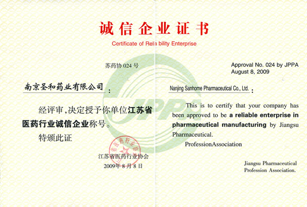 2009江蘇省醫(yī)藥行業(yè)誠(chéng)信企業(yè)稱號(hào)