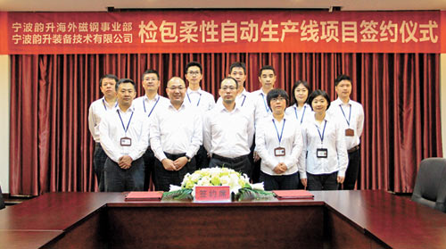 4月23日,海外磁鋼事業(yè)部就檢包柔性自動(dòng)生產(chǎn)線(xiàn)項(xiàng)目與裝備技術(shù)公司進(jìn)行正式合同的簽署。通過(guò)7個(gè)月的調(diào)研、論證、設(shè)計(jì),雙方從理論上確定了符合自動(dòng)線(xiàn)設(shè)計(jì)制作的可行性,不久的將來(lái),永磁產(chǎn)業(yè)包裝自動(dòng)生產(chǎn)線(xiàn)將實(shí)現(xiàn)從0到1的突破。股份公司領(lǐng)導(dǎo)竺曉東、毛應(yīng)才等出席了當(dāng)天的合同簽署儀式。